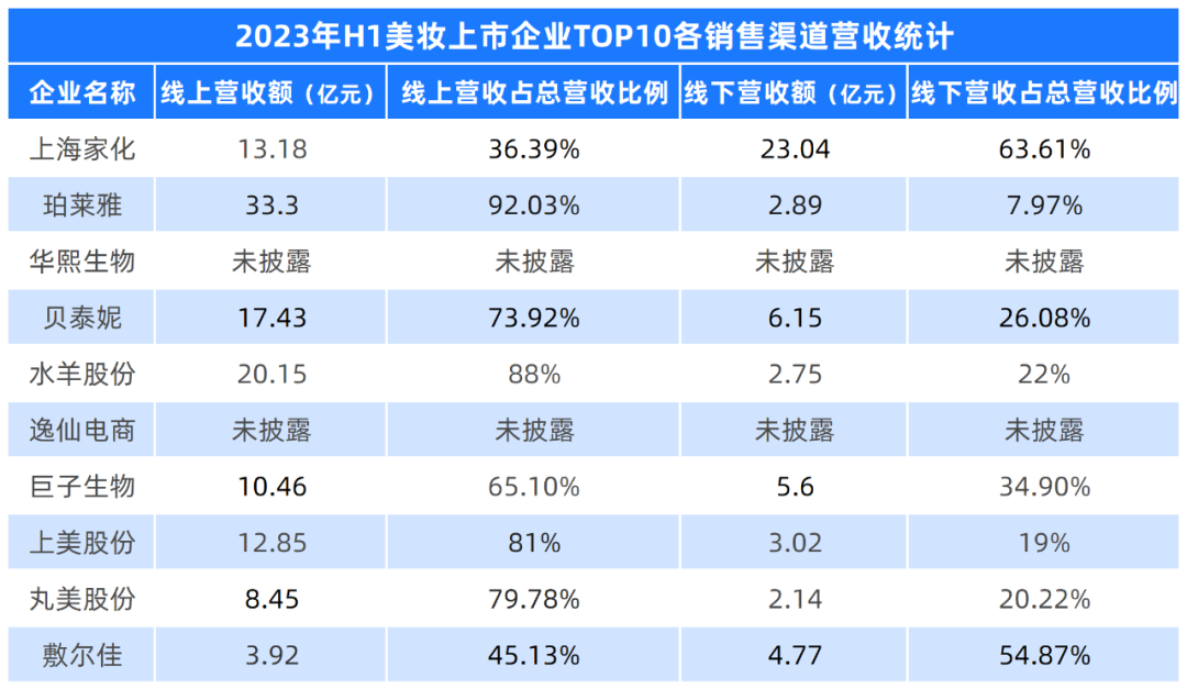 從主營銷售渠道來看,十家美妝企業(yè)中,除了上海家化和敷爾佳的線下收入占比超過50%,其余品牌公司的線下收入占比都不高。電商依舊是美妝的主要銷售渠道,尤其是以抖音為代表的直播電商平臺,對品牌營收的貢獻增長顯著。此外,線下渠道開始復蘇,大多數(shù)企業(yè)開始重視線下渠道的布局。