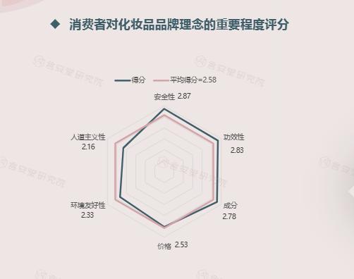 根據(jù)言安堂發(fā)布的《綠色、純凈美妝市場(chǎng)趨勢(shì)和消費(fèi)者調(diào)研》中,消費(fèi)者認(rèn)為安全性、功效性、成分等理念在美妝品牌理念中更為重要,而與純凈美妝相關(guān)的“人道主義性”、“環(huán)境影響性”則屬于錦上添花的概念。