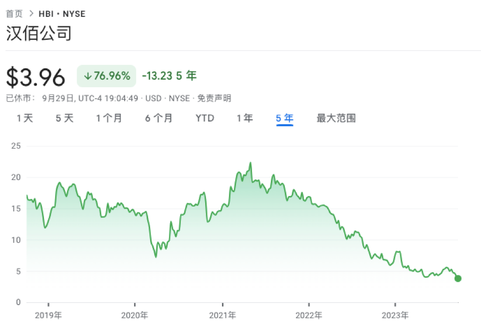 2021年5月,HanesBrands股價(jià)在20美元上下浮動(dòng),到現(xiàn)在,已經(jīng)跌至4美元以下。