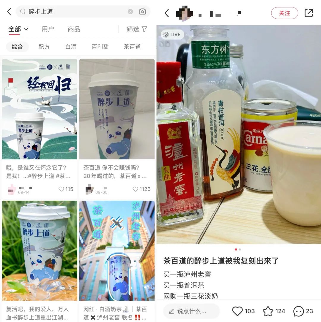 奶茶方面最成功的白酒聯(lián)名當屬瀘州老窖與茶百道推出的「醉步上道」,2020年上線后即成為當時的王牌產(chǎn)品,而在今年醬香拿鐵爆火后,不少用戶都跑到茶百道的社交賬號上要求重新上架「醉步上道」,小紅書上更有不少網(wǎng)友自己買來了瀘州老窖來復(fù)刻該款產(chǎn)品。