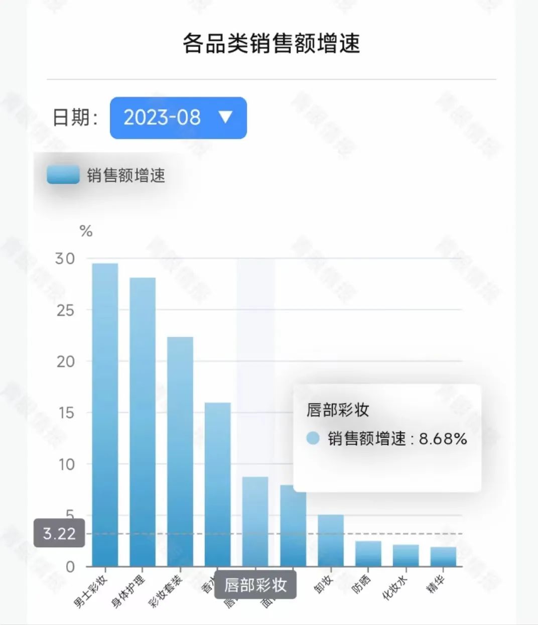 另外,8月份唇部彩妝品類銷售額增速達到8.68%,在各品類中排名第五;而去年8月,唇部彩妝增速未上榜,唇部護理銷售額增速也僅為3.55%。從占比方面看,8月份唇部彩妝占比為5.50%,占比已超過防曬、香水等品類,而去年同月,唇部彩妝占比為4.78%。