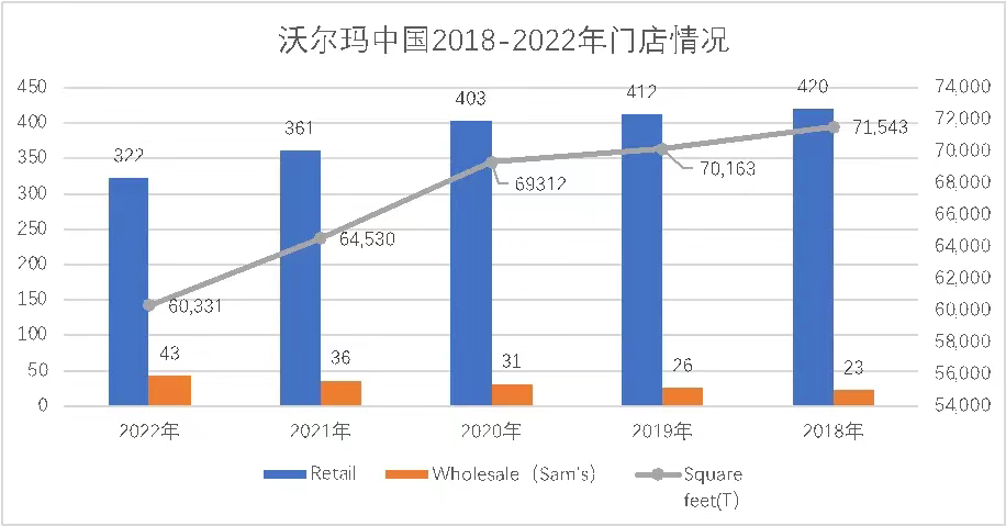 (3)2018-2022年,沃爾瑪中國(guó)大賣(mài)場(chǎng)的門(mén)店數(shù),從420家銳減至322家,五年關(guān)閉近100家;與此同時(shí),山姆會(huì)員店從23家擴(kuò)張到43家店。