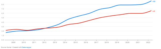 *兩家進(jìn)入英國(guó)20多年,合計(jì)市占率16%左右。與英國(guó)零售業(yè)整體銷(xiāo)售額下降4%的慘淡行情形成鮮明對(duì)比。ALDI擁有960家門(mén)店,LIDL則為920家。均以每周一家新店的速度擴(kuò)張。