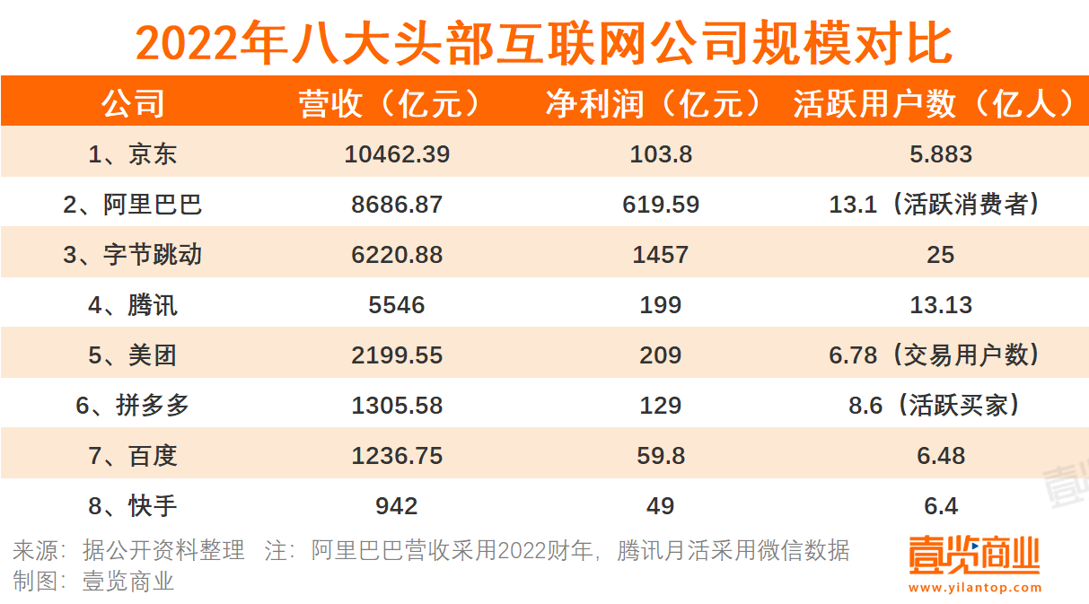 考慮到字節(jié)跳動的營收規(guī)模,增速放緩也可以理解。與此同時,從2021年虧損71.5億美元到2022年200億凈利潤,字節(jié)跳動的主營業(yè)務(wù)實現(xiàn)了扭虧為盈。壹覽商業(yè)橫向?qū)ν惼髽I(yè)發(fā)現(xiàn),國內(nèi)互聯(lián)網(wǎng)巨頭格局,正在發(fā)生改變。