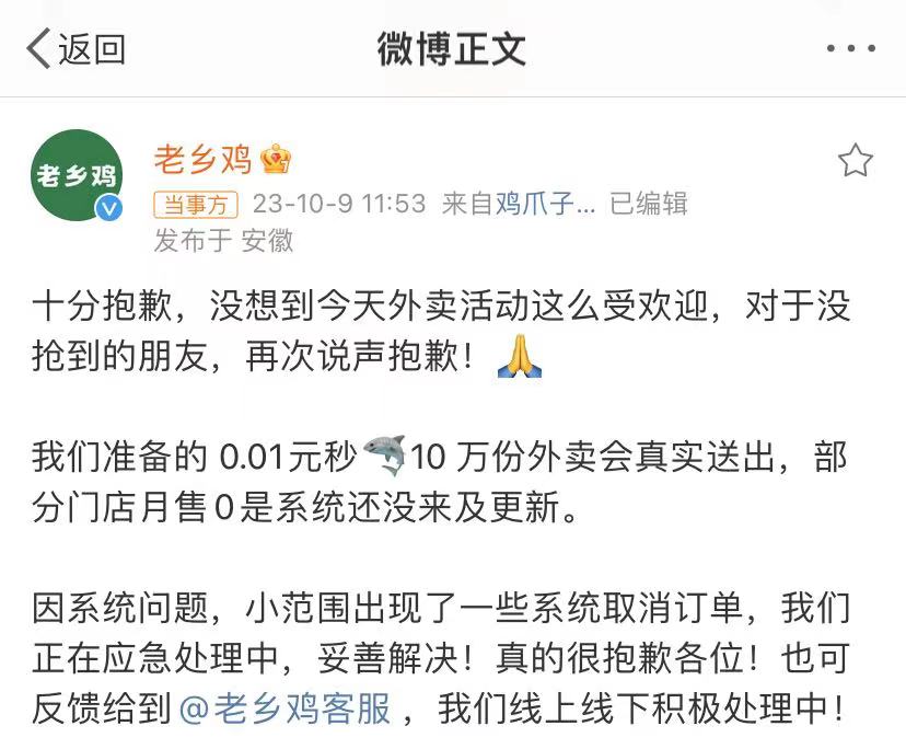 10月9日午間,老鄉(xiāng)雞在微博發(fā)布公告稱,沒想到今天外賣活動(dòng)這么受歡迎,對(duì)于沒搶到的朋友,再次說(shuō)聲抱歉。其準(zhǔn)備的0.01元秒殺10萬(wàn)份外賣會(huì)真實(shí)送出,部分門店月售0是系統(tǒng)還沒來(lái)得及更新。因某外賣平臺(tái)系統(tǒng)問題,小范圍出現(xiàn)了一些系統(tǒng)取消訂單,正在應(yīng)急處理中,妥善解決。