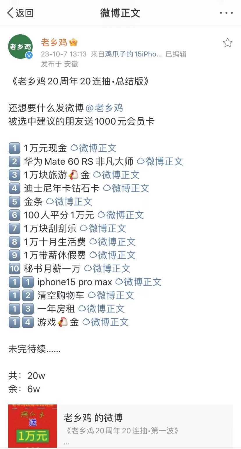 翻閱老鄉(xiāng)雞官博發(fā)現(xiàn),這場(chǎng)20周年慶活動(dòng)自9月26日開始至今,已經(jīng)持續(xù)了14天,活動(dòng)以“老鄉(xiāng)雞20周年20連抽”為主題,消費(fèi)者只需關(guān)注老鄉(xiāng)雞官博并轉(zhuǎn)發(fā)抽獎(jiǎng)微博即可參與。