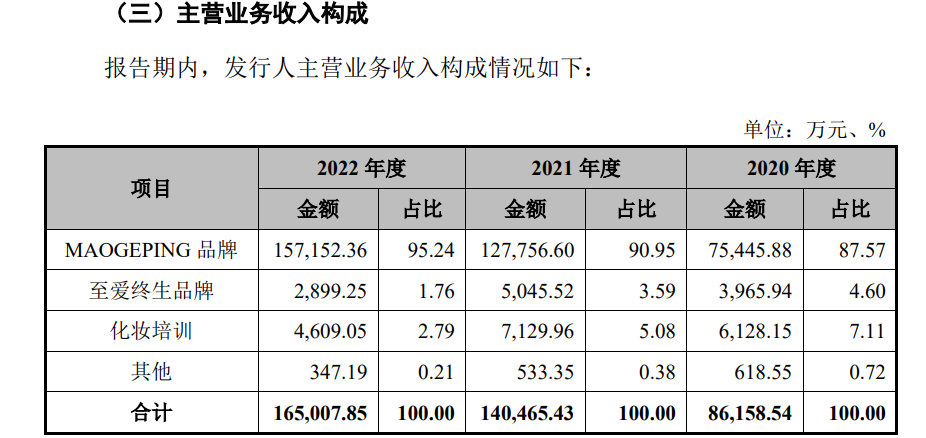 壹覽商業(yè)分析毛戈平招股書(shū)發(fā)現(xiàn),產(chǎn)品結(jié)構(gòu)單一是其顯要短板。毛戈平旗下只有MAOGEPING與至愛(ài)終生兩個(gè)品牌,其中,MAOGEPING占主營(yíng)業(yè)務(wù)收入87.57%。除此之外,毛戈平一直聞名的化妝培訓(xùn)業(yè)務(wù)收入僅占主營(yíng)業(yè)務(wù)收入的7.11%。
