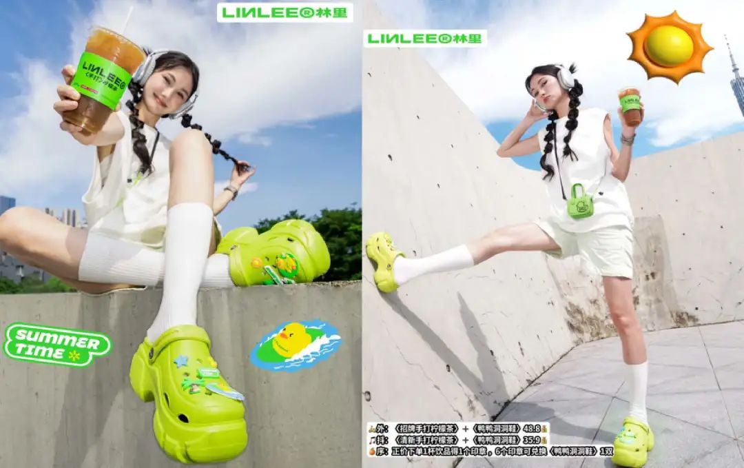 今年夏天“丑鞋”洞洞鞋成了潮人必備,林里順勢(shì)推出了48.8元洞洞鞋套餐,鞋子顏色檸檬綠,出街一腳上去沒人敢說你不潮,重點(diǎn)是它還免費(fèi)送鞋花,仿佛暗戳戳地說:“這還不拿下你?”