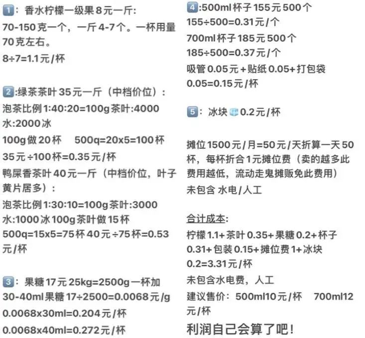 一般連鎖檸檬茶品牌的單瓶定價(jià)在20元左右,地鐵口創(chuàng)業(yè)組的小攤也要10-15元,但實(shí)際成本價(jià)或許只有3元。小紅書網(wǎng)友@暴躁熱狗 在不計(jì)人工和損耗的情況下,算出一杯鴨屎香檸檬茶的成本價(jià)3元。(香水檸檬1元、鴨屎香5角、蔗糖糖漿5角、打包費(fèi)1元)