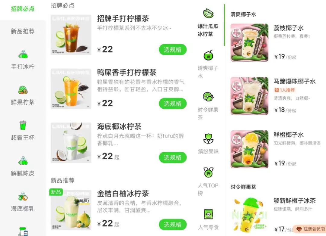 直到我2個(gè)月前點(diǎn)了第一杯林里。打開菜單才知道,如今的檸檬茶已經(jīng)不是我以為的那些傳統(tǒng)的凍檸茶了,而是像奶茶一樣五顏六色,除了茶基底和香水檸檬,還有時(shí)令水果和各種蔬菜。