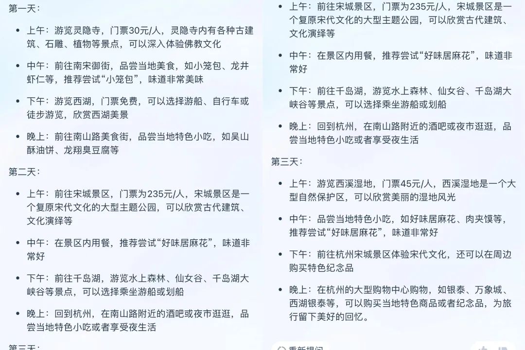 以“旅行策劃人”為例,壹覽商業(yè)輸入“幫忙定制三日杭州行計(jì)劃”的需求后,淘寶問問給出了每日的行程意見,如圖可見,給出的攻略較為寬泛,雖然提供了大致的地點(diǎn),但是并沒有給出具體的店面建議。