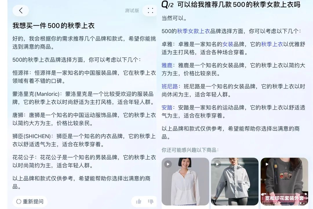到了淘寶問問比較擅長(zhǎng)的電商導(dǎo)購環(huán)節(jié),壹覽商業(yè)輸入“我想買一件500的秋季上衣”,淘寶問問給出了5個(gè)品牌作為參考。隨后,壹覽商業(yè)將問題更改為“可以給我推薦幾款500的秋季女款上衣嗎”,淘寶問問在給出品牌的同時(shí)也給出了建議產(chǎn)品的鏈接,三件產(chǎn)品均來自于同一品牌。