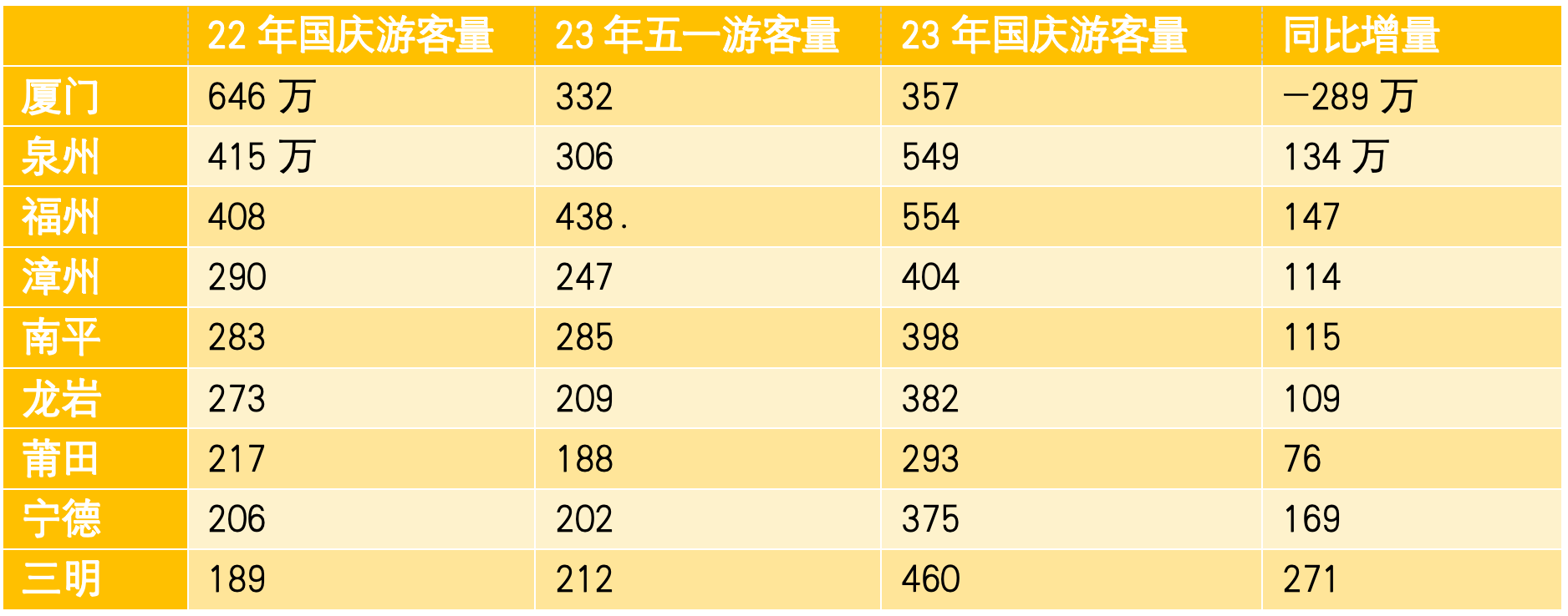 早年旅游市場(chǎng)權(quán)重廈門市在去年國(guó)慶有646萬(wàn)游客,到今年國(guó)慶只有357萬(wàn)游客,直接減少289萬(wàn)。廈門占福建游客量市場(chǎng)份額從23.86%直降到10.26%,中間一路下滑,無(wú)法止跌。今年國(guó)慶節(jié)期間,廈門有群眾發(fā)視頻抱怨游客減少、生意難做,廈門旅游數(shù)據(jù)確實(shí)不容樂(lè)觀。核心增量主要是三明市等內(nèi)陸小城市獲取,三明增量達(dá)271萬(wàn),旅游人數(shù)遠(yuǎn)超當(dāng)?shù)貞艏丝诮槐,游客成為三明市核心消費(fèi)群體。福州、泉州兩大城市依舊穩(wěn)步增長(zhǎng),但增幅遠(yuǎn)低于四五線小城市。整體福建市場(chǎng)游客相對(duì)去年國(guó)慶檔增量近千萬(wàn),對(duì)于一個(gè)只有3000多萬(wàn)戶籍人口的省份,這種消費(fèi)轉(zhuǎn)移在一定程度上會(huì)改變?cè)瓉?lái)的市場(chǎng)格局。