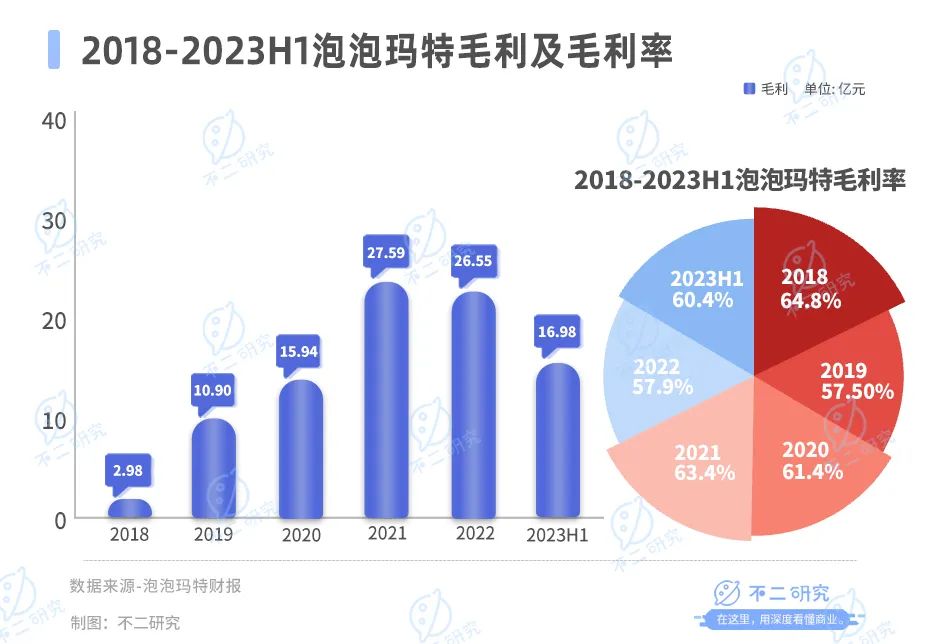 從毛利率來看,泡泡瑪特2018-2022年毛利率逐年下滑,分別為57.9%、64.8%、63.4%、61.4%、57.5%,而今年上半年,泡泡瑪特的毛利率為60.4%。