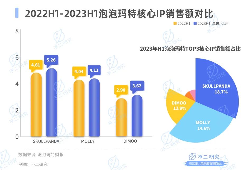 IP是泡泡瑪特業(yè)務(wù)的核心,2023年上半年的營收主要依靠自有IP和獨(dú)家IP,占比達(dá)到76.9%。其中,SKULLPANDA、MOLLY、DIMOO三個(gè)核心IP,銷售收入分別占總收入的18.7%、14.6%、12.9%。