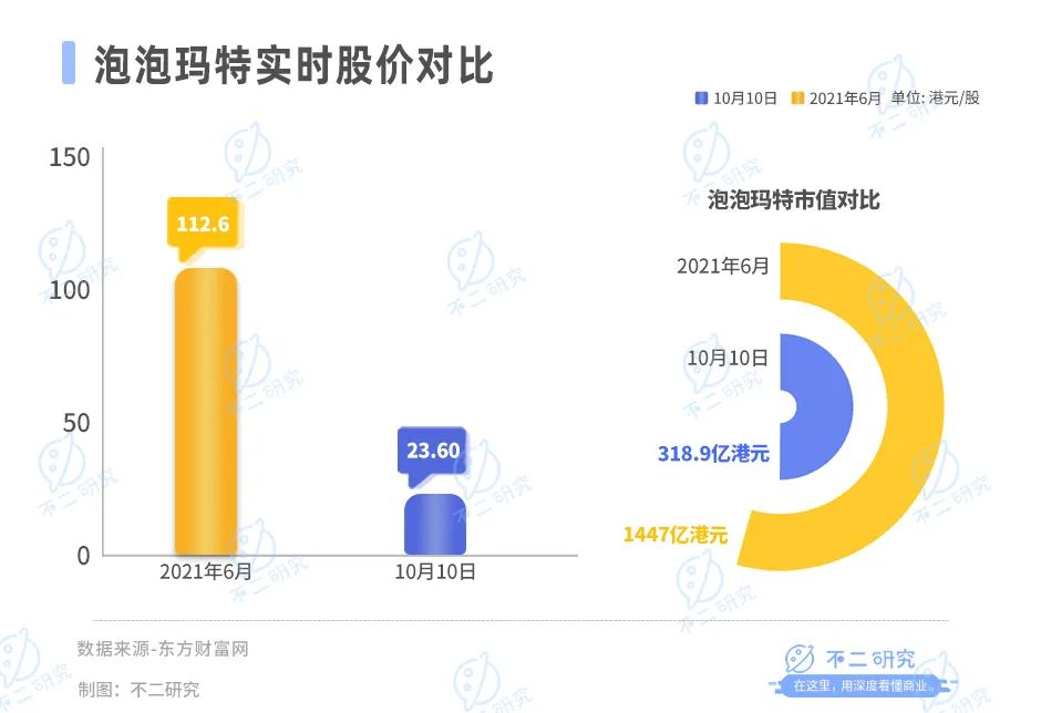 截至10月10日港股收盤,泡泡瑪特報(bào)收23.60港元/股,對(duì)應(yīng)市值318.9億港元(約折合人民幣297.35億元);對(duì)比2021年6月的市值高點(diǎn)1447億港元,市值已縮水77.96%。