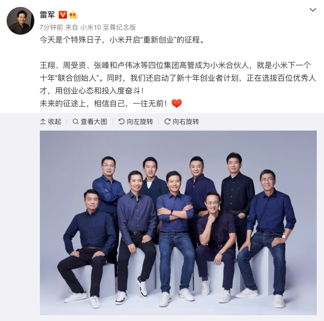 隨著張峰離職,雷軍選出的下一個十年的4位聯(lián)合創(chuàng)始人只剩下了盧偉冰一人。而小米早期的8位元老級聯(lián)合創(chuàng)始人,目前大多也不再與雷軍一同奮斗在業(yè)務一線。