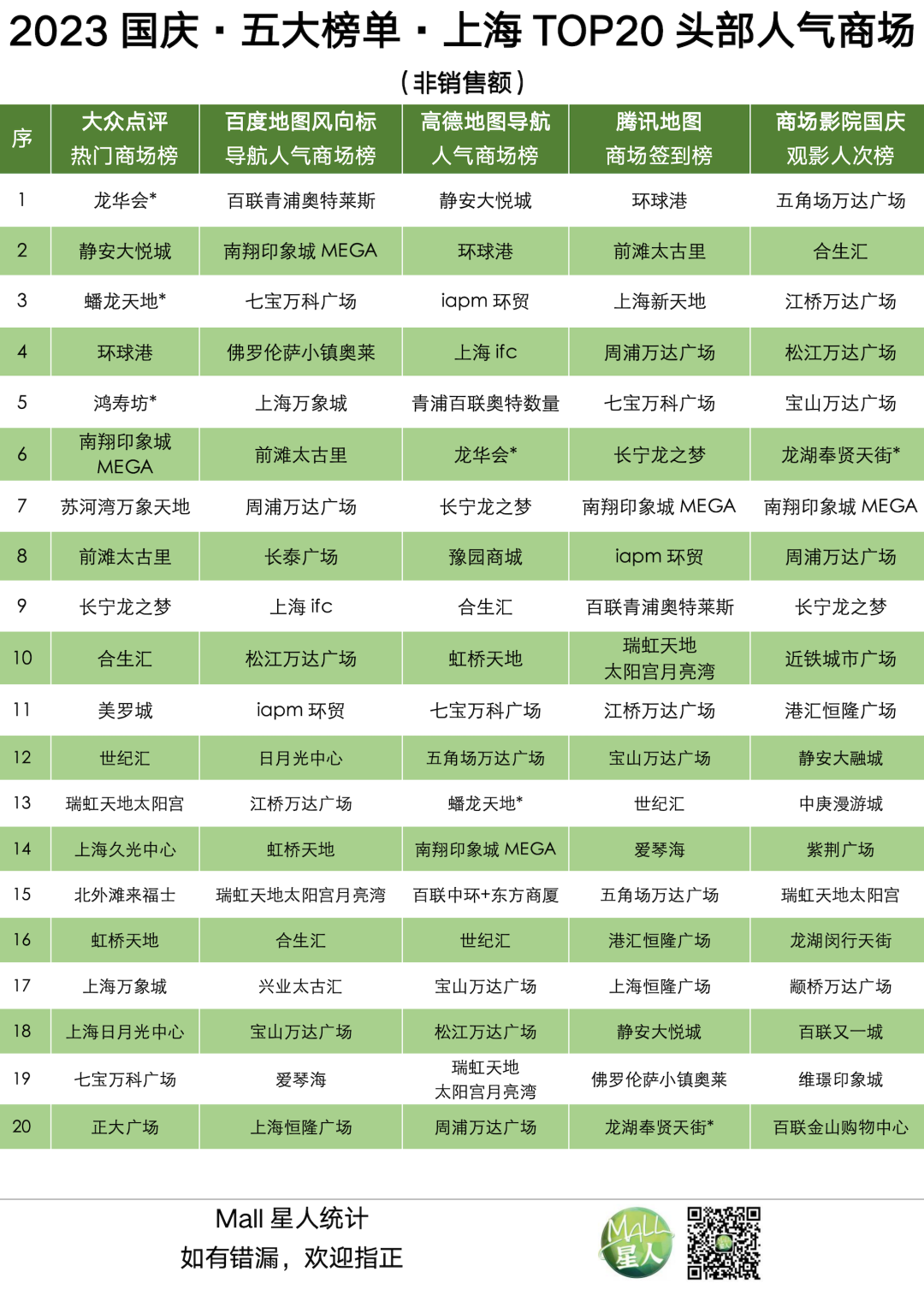 Mall星人整理了一份2023國慶期間上海商場人氣榜榜單,以大眾點評、貓眼、高德、百度地圖和騰訊地圖等平臺的數據為依據,從個五大維度窺見國慶長假的人氣商場排名。除這部分數據外,其它數據來自各區(qū)發(fā)布及各項目方等渠道(本文排名均不分先后)。