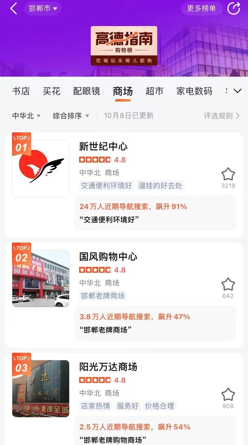 從高德指南購(gòu)物榜上看,截至10月8日的數(shù)據(jù),新世紀(jì)中心位列中華北地區(qū)購(gòu)物榜榜首,且近期導(dǎo)航搜索人次達(dá)24萬(wàn)人,是其他商場(chǎng)的6倍以上,而91%的飆升值也表明了項(xiàng)目在國(guó)慶期間的高熱度。同時(shí)大眾點(diǎn)評(píng)上4.8分的評(píng)分,也是邯鄲好評(píng)榜的首位。
