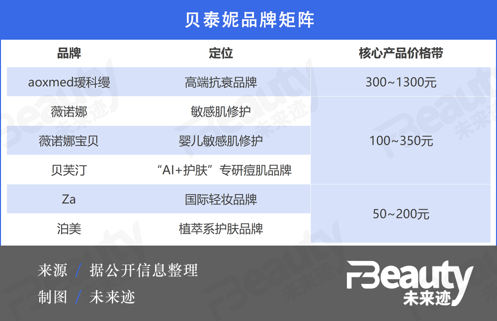 從品牌矩陣看,貝泰妮集團目前聚焦于功效護膚賽道,已經打造了薇諾娜、薇諾娜寶貝、貝芙汀、Aoxmed璦科縵四大主品牌。完成此次收購后,貝泰妮的品牌地圖中將再加上泊美、Za的身影。