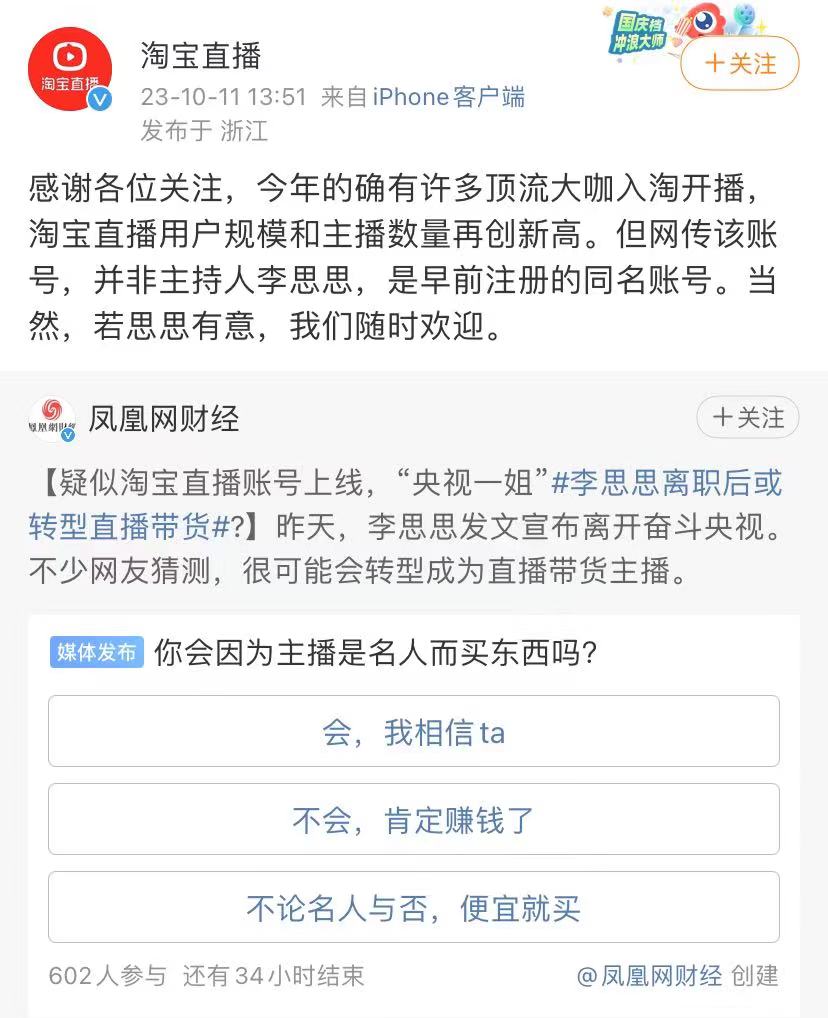 10月11日,淘寶直播在官博回應(yīng)稱,“網(wǎng)傳該賬號(hào)并非主持人李思思,是早前注冊(cè)的同名賬號(hào)。當(dāng)然,若思思有意,我們隨時(shí)歡迎”,此外,淘寶直播還透露,“今年的確有許多頂流大咖入淘開播,淘寶直播用戶規(guī)模和主播數(shù)量再創(chuàng)新高”。
