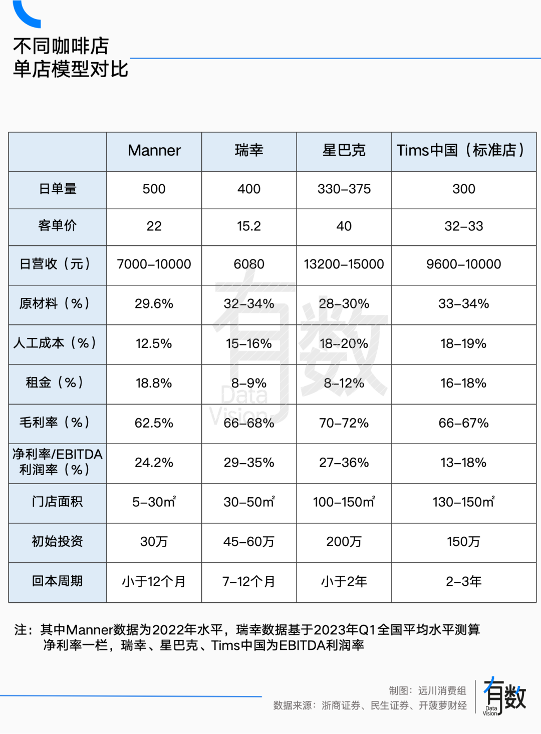 一位投資人曾表示,早期一家Manner的前期投入只需30萬,3個多月就可以回本[12]。對比而言,瑞幸一開始的回本周期為在2年左右[13]。