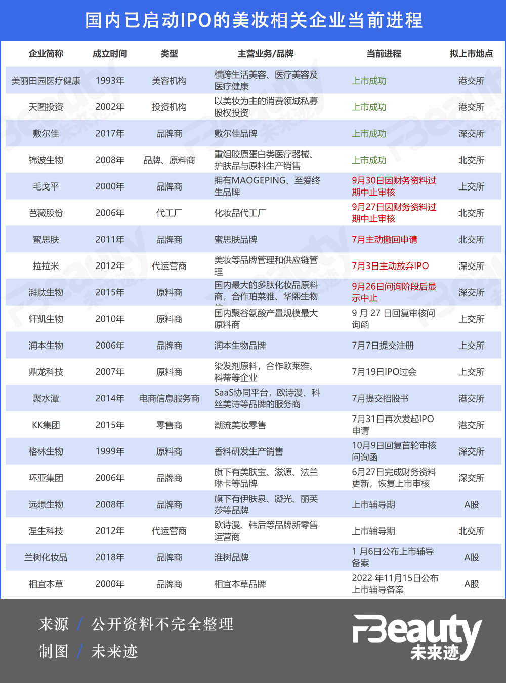 《FBeaty 未來跡》不完全整理發(fā)現(xiàn),截至今年10月,已經(jīng)有5家美妝相關(guān)企業(yè)IPO進(jìn)程呈現(xiàn)中止/終止?fàn)顟B(tài),而放眼整個(gè)美妝行業(yè),共有接近20家美妝企業(yè)走在上市路上。