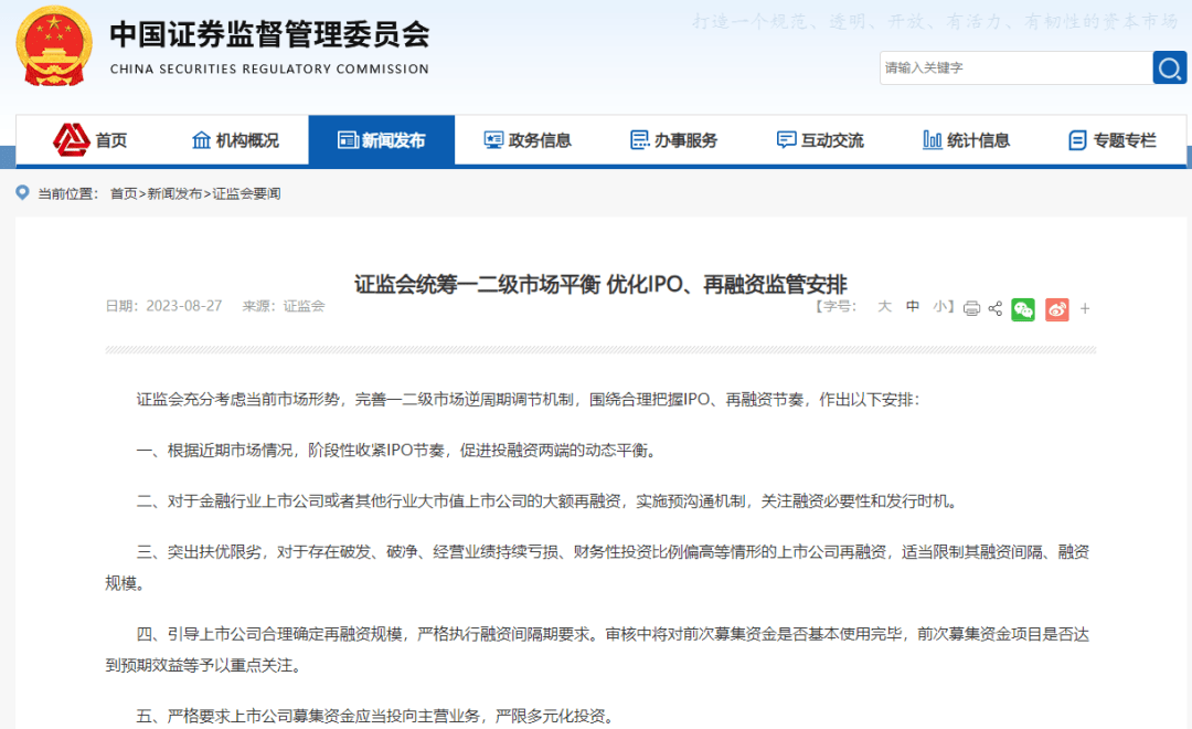 此外,相關(guān)政策也在收緊。今年(2023年)8月27日,中國證券監(jiān)督管理委員會宣布,充分考慮當(dāng)前市場形勢,完善一二級市場逆周期調(diào)節(jié)機(jī)制,圍繞合理把握IPO、再融資節(jié)奏,進(jìn)一步規(guī)范股份減持行文等做出一系列安排。