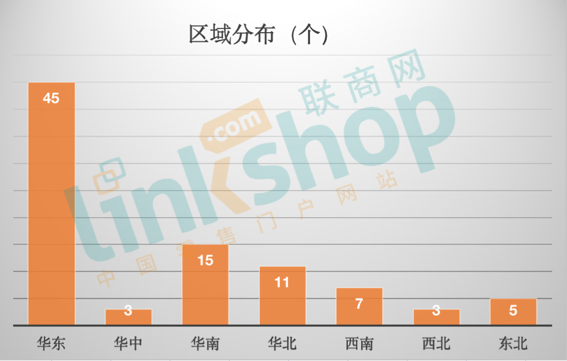 整體來看,9月新開的89個商業(yè)項(xiàng)目分布在七個大區(qū),華東強(qiáng)勢領(lǐng)跑,華南、西南緊隨其后,華北、東北擺脫了8月份交白卷的尷尬,華中和西北墊底。