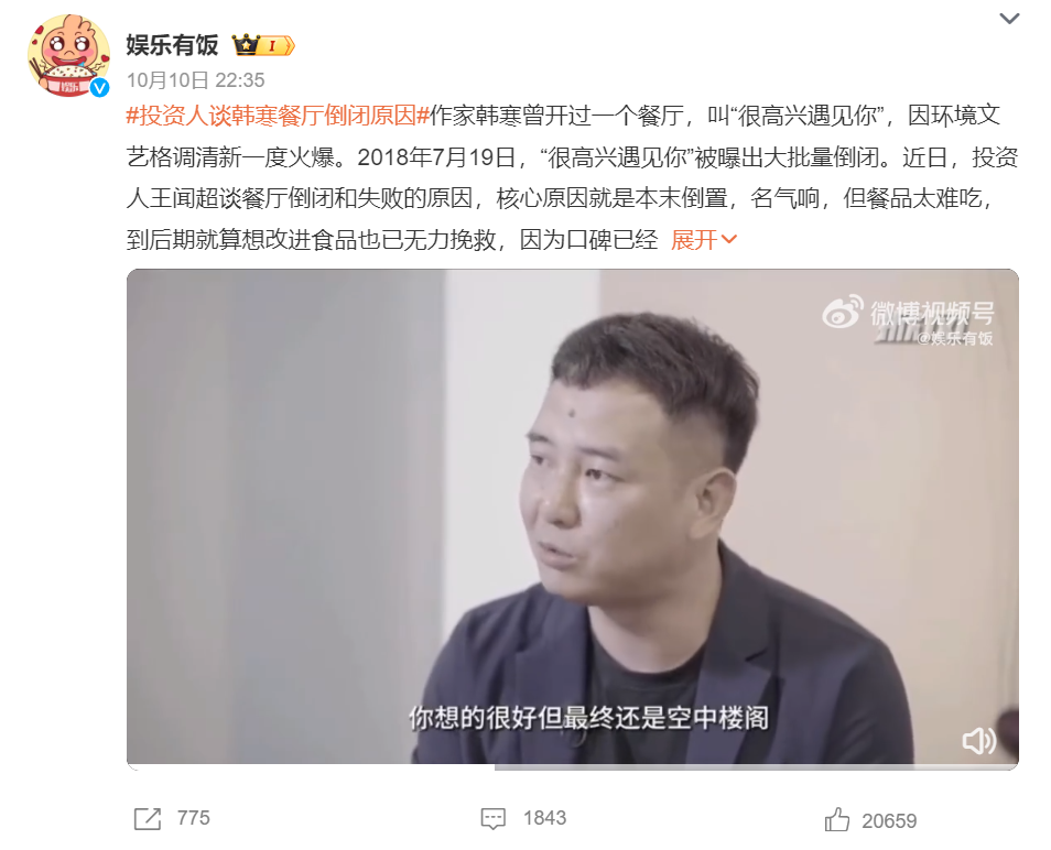 10月11日,#投資人爆料韓寒因餐廳虧損上億# 沖上熱搜。