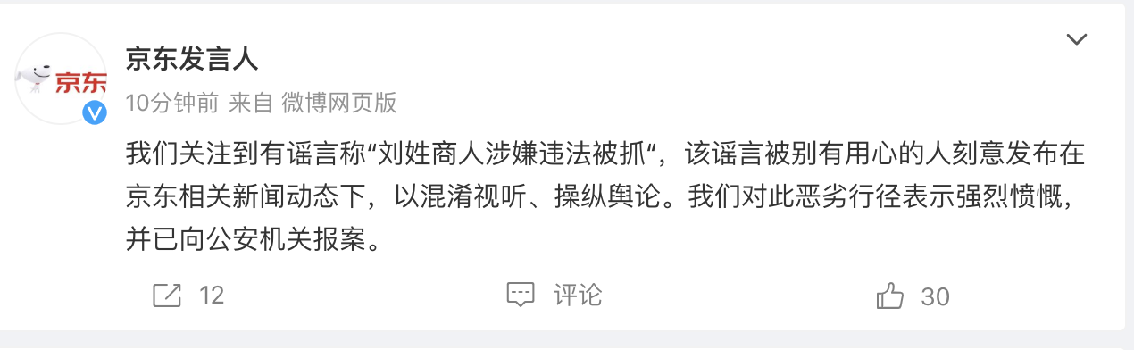 10月13日,京東官方微博@京東發(fā)言人發(fā)文辟謠稱,我們關(guān)注到有謠言稱“劉姓商人涉嫌違法被抓”,該謠言被別有用心的人刻意發(fā)布在京東相關(guān)新聞動(dòng)態(tài)下,以混淆視聽、操縱輿論。我們對(duì)此惡劣行徑表示強(qiáng)烈憤慨,并已向公安機(jī)關(guān)報(bào)案。