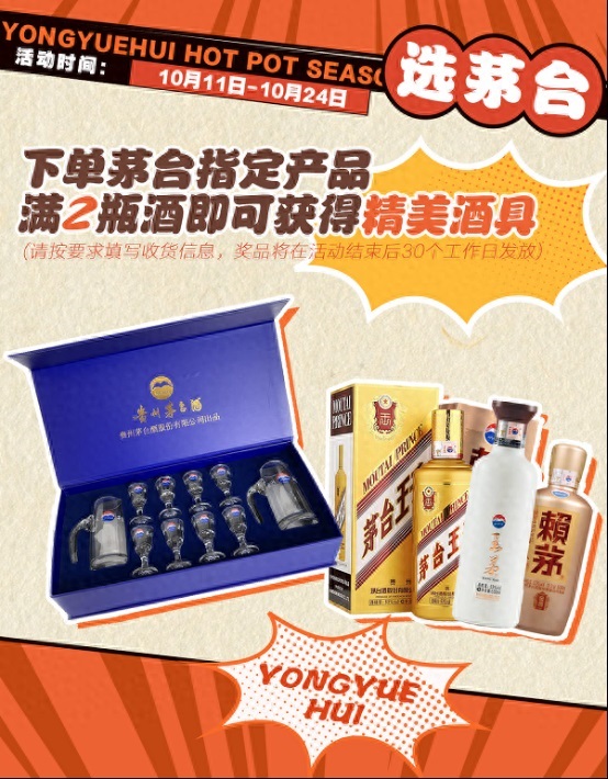其中,針對“銅火鍋X白酒”的搭配,永輝生活-詠悅匯酒庫推出習(xí)酒秒殺活動。10月17日-10月19日期間,多款習(xí)酒產(chǎn)品均參與秒殺;此外,自10月11日起至10月24日,在永輝生活-詠悅匯酒庫下單茅臺指定產(chǎn)品滿2瓶酒即可獲得精美酒具,有53度茅臺王子酒(金王子)500ml、茅臺王茅酒(祥邦/白)500ml、賴茅53°金樽酒500ml等參與活動。