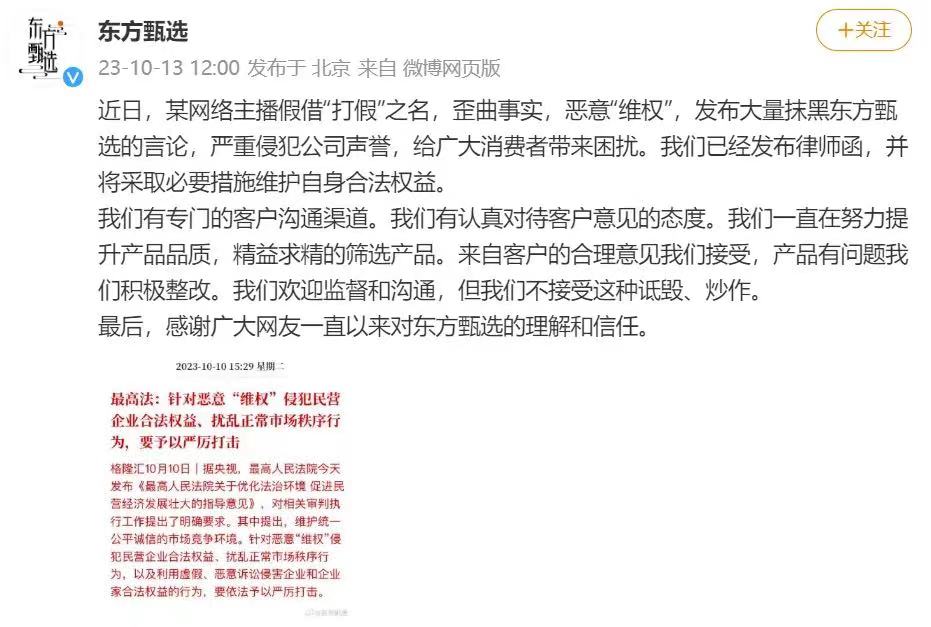 聯(lián)商快訊:10月13日,針對鐵頭稱將打假東方甄選的消息,東方甄選發(fā)布公告稱:“近日,某網(wǎng)絡(luò)主播假借‘打假’之名,歪曲事實,惡意‘維權(quán)’,發(fā)布大量抹黑東方甄選的言論,嚴(yán)重侵犯公司聲譽,給廣大消費者帶來困擾。我們已經(jīng)發(fā)布律師函,并將采取必要措施維護(hù)自身合法權(quán)益。我們有專門的客戶溝通渠道。我們有認(rèn)真對待客戶意見的態(tài)度。我們一直在努力提升產(chǎn)品品質(zhì),精益求精的篩選產(chǎn)品。來自客戶的合理意見我們接受,產(chǎn)品有問題我們積極整改。我們歡迎監(jiān)督和溝通,但我們不接受這種詆毀、炒作!