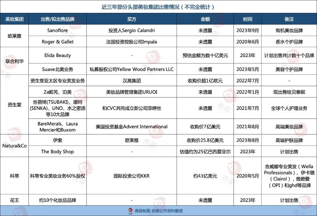 縱觀全球美妝市場,為了聚焦優(yōu)勢領(lǐng)域,多家企業(yè)早已開始重整品牌矩陣。據(jù)青眼不完全統(tǒng)計(jì),2020年以來,包括歐萊雅、聯(lián)合利華、資生堂、科蒂、Natura&Co在內(nèi)的多個(gè)頭部集團(tuán)已經(jīng)拋售了超20個(gè)品牌或品牌部分地區(qū)業(yè)務(wù),其中,僅資生堂就出售了約16個(gè)品牌。