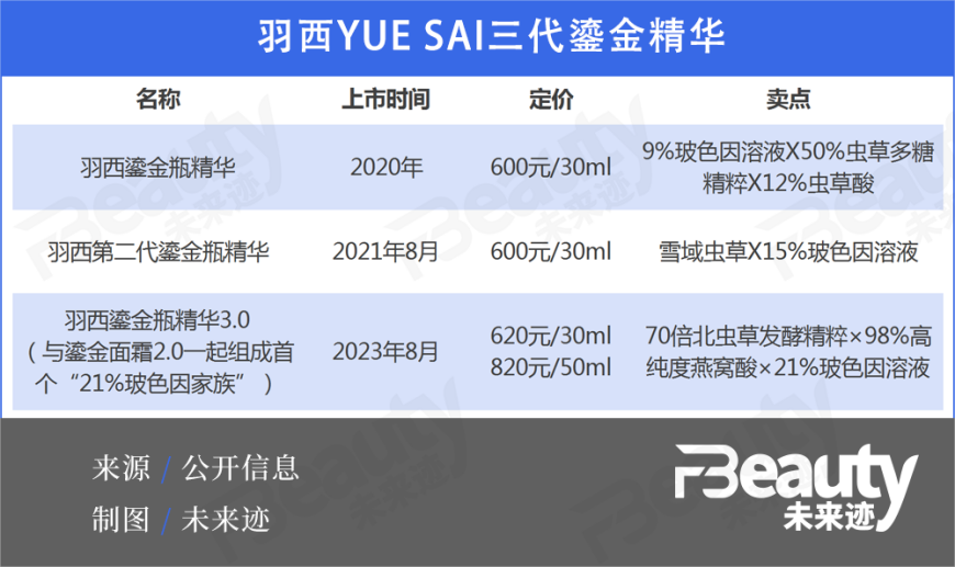 據(jù)《FBeauty未來跡》統(tǒng)計(jì)發(fā)現(xiàn),羽西對(duì)王牌鎏金系列三代升級(jí)的核心看點(diǎn),在于玻色因溶液濃度的不斷拉高以及中草藥配方的優(yōu)化。從品牌宣介的第三代鎏金瓶精華的配方看,發(fā)酵底物從“雪域蟲草”升級(jí)為膠原促生能力更強(qiáng)的珍稀漢草成分“北蟲草”,新品所添加的北蟲草發(fā)酵精粹中的蟲草素濃度相較于上一代提高70倍。而且除了玻色因,還新增了98%純度的發(fā)酵燕窩酸精粹。