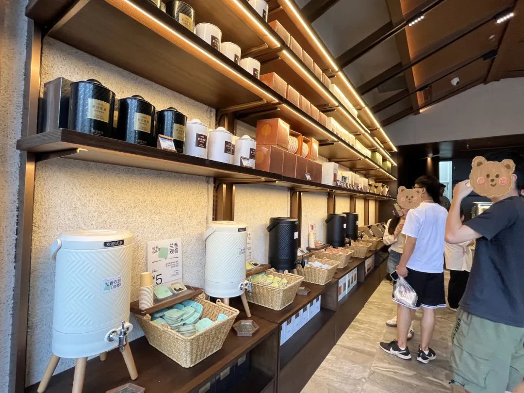 入口左側(cè)是一面展示墻,上側(cè)是罐裝茶葉、茶禮盒、茶具等產(chǎn)品,下面設(shè)置為試喝區(qū),這里有蘭香觀音、梔子綠、小蠻紅、月光白、米香烏龍、老樅水仙等6款茶水不限量試喝,旁邊擺放著相應(yīng)的小盒茶。