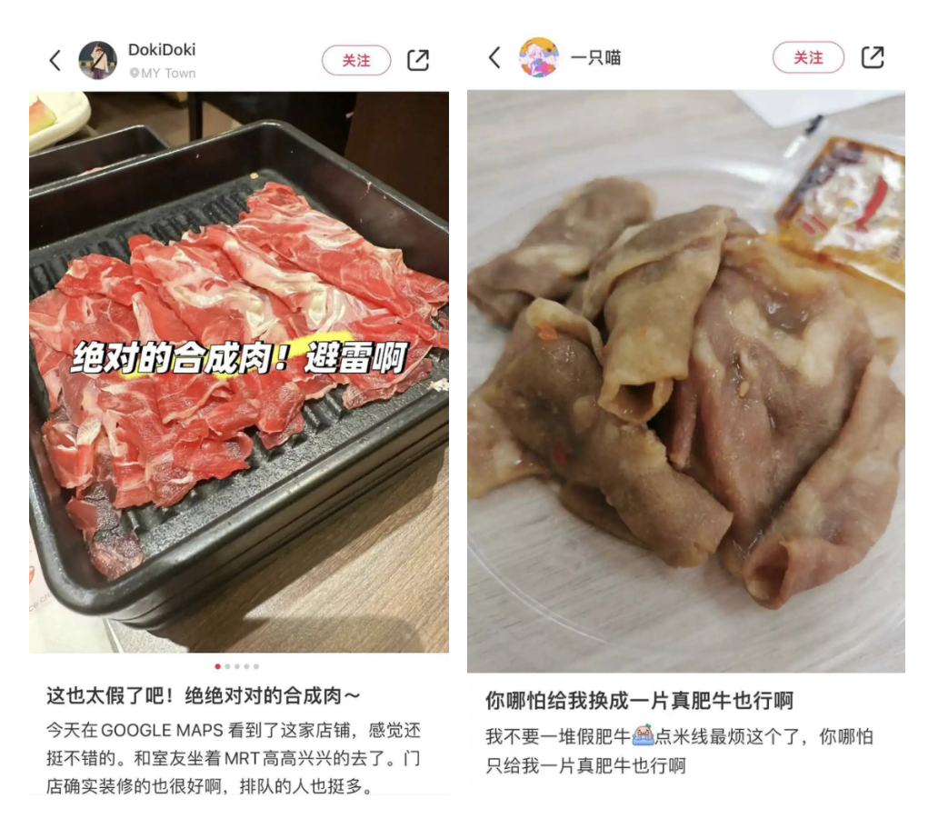 火鍋里的肥牛肥羊卷,麻辣燙燒烤都是合成肉的天下。之前短視頻博主“猴大腕”,曝光了張亮麻辣燙以及巴奴旗下子品牌“超島自選火鍋”北京合生匯店賣“假羊肉”,小紅書甚至有網友一度表示自己的底線是“去楊國福只吃素菜”。