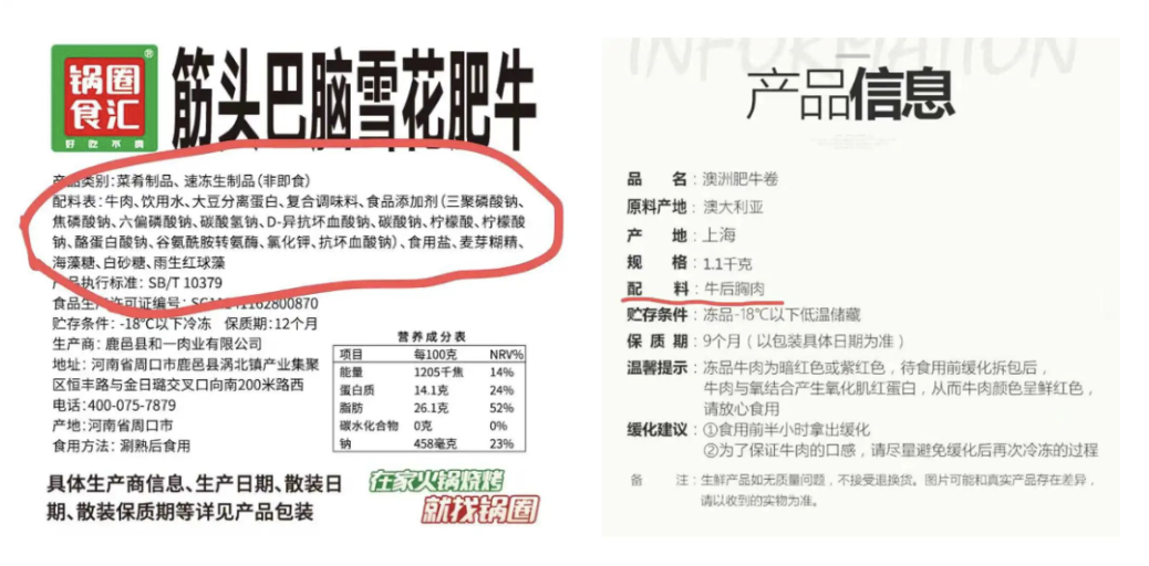 逛一趟鍋圈,拿起9塊9四片“肉質鮮美”的歐式培根,猛然發(fā)現(xiàn)是豬肉鴨肉雞肉合成的。不想吃合成肉,放下培根,再看看33塊“富含脂肪紋路”的整切眼肉牛排,結果這邊配料表密密麻麻三行字。搞不明白,那賣49一份的羔羊肉總該沒問題了吧。