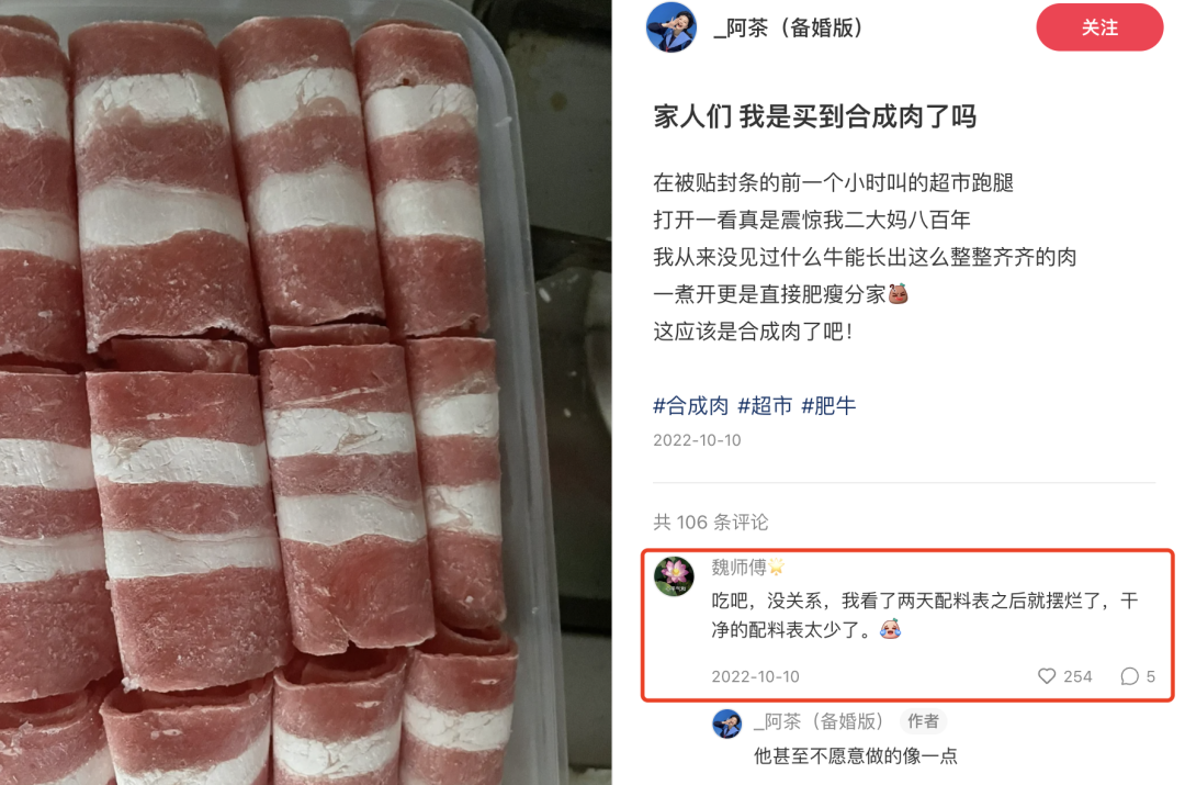 但是要說年輕人因絕望而對合成肉就此忍讓、面對配料表自戳雙目,那是假的。該看的還是得看、該懷疑的還是得懷疑,頂多心態(tài)從“我一定要吃真肉”變成了“合成就合成吧,別騙我錢/吃壞我”就行。