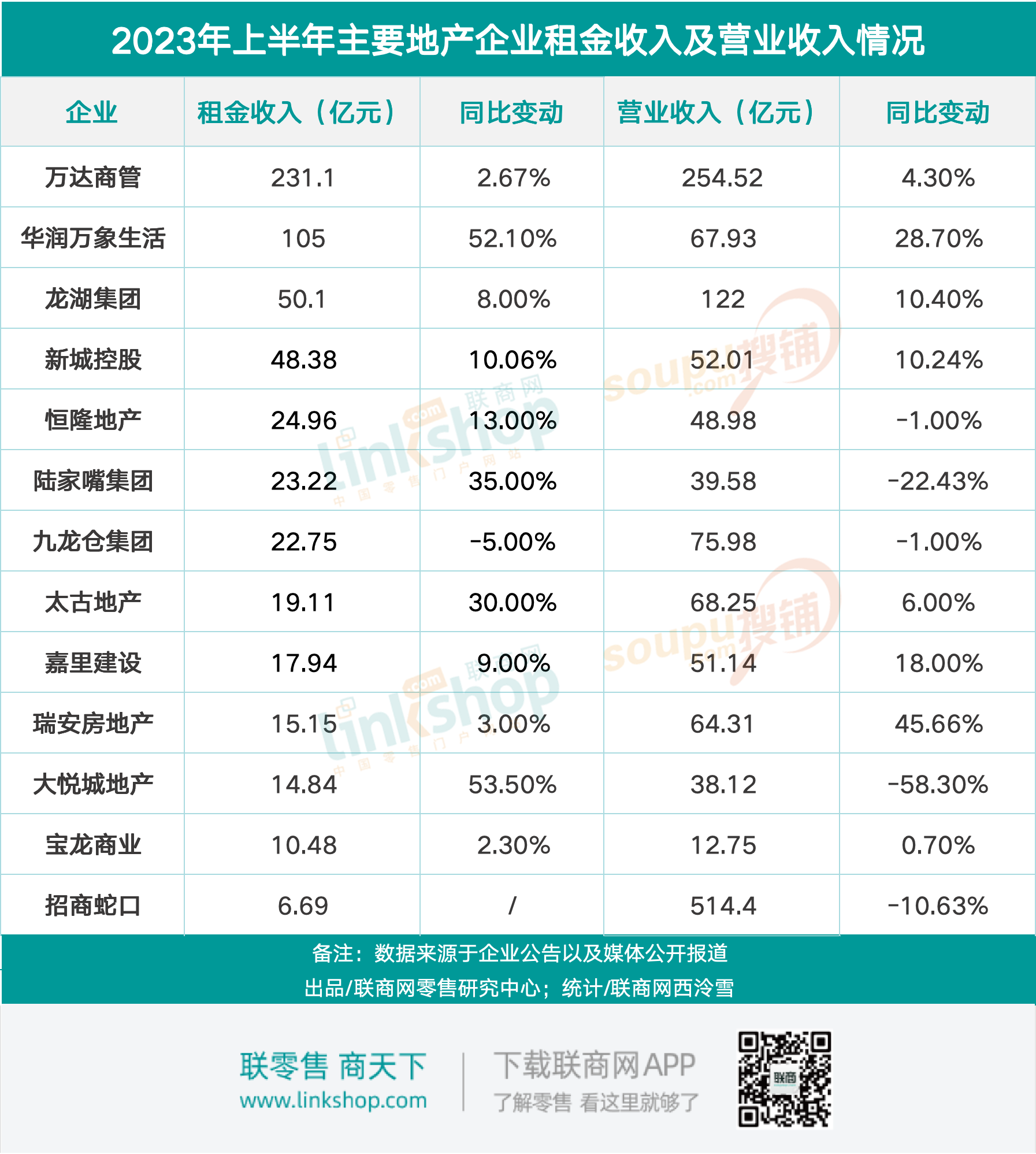 《聯(lián)商網(wǎng)》統(tǒng)計發(fā)現(xiàn),2023年上半年,萬達商管、華潤萬象生活、新城控股、龍湖集團、大悅城地產(chǎn)、寶龍商業(yè)等13家地產(chǎn)企業(yè)實現(xiàn)營業(yè)收入超1409億元,租金收入超589億元。