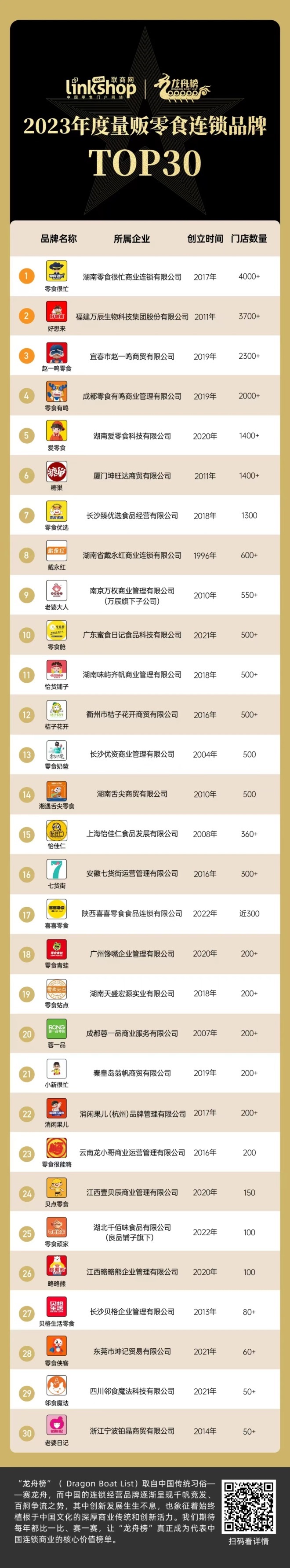 本期,《聯(lián)商網(wǎng)》將聚焦量販零食連鎖品牌,特別推出龍舟榜之“2023年度量販零食連鎖品牌TOP30”,從門店數(shù)量、消費(fèi)者滿意度、市場融資情況等維度一窺各大品牌的經(jīng)營和發(fā)展情況,以及量販零食行業(yè)呈現(xiàn)的發(fā)展特征及未來空間。