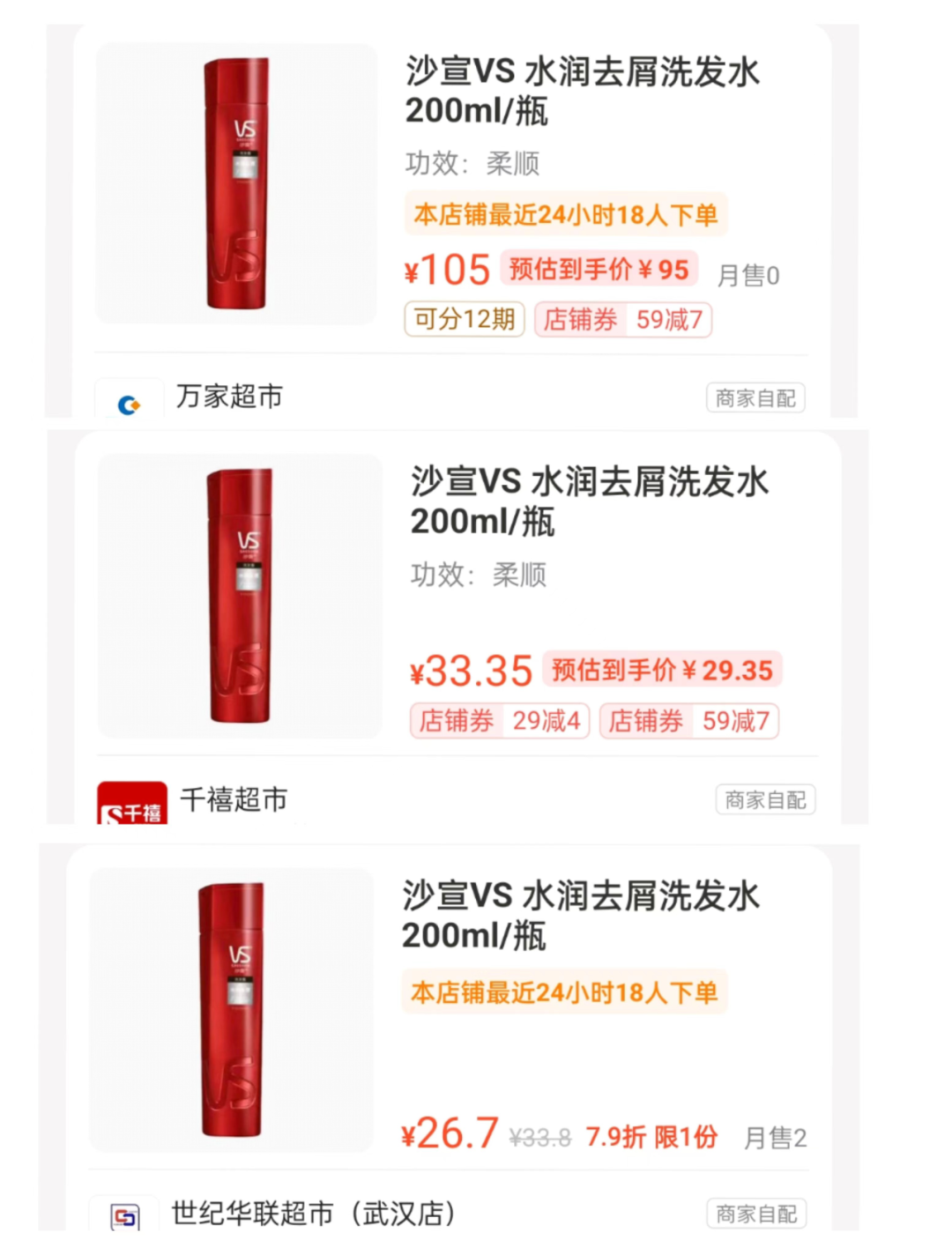 沙宣在某到家平臺的多個實體超市售價