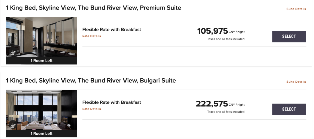 上海寶格麗酒店部分房型報(bào)價(jià),圖源:酒店官網(wǎng)