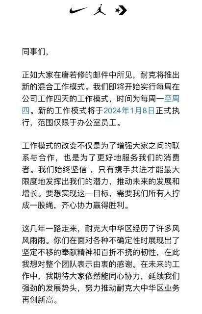 聯(lián)商快訊:10月20日,耐克大中華區(qū)近日發(fā)布內(nèi)部信,宣布推出新的混合工作模式。在新模式下,每周在公司工作四天,時(shí)間為每周一至周四。新的工作模式將于2024年1月8日正式執(zhí)行,范圍僅限于辦公室員工。