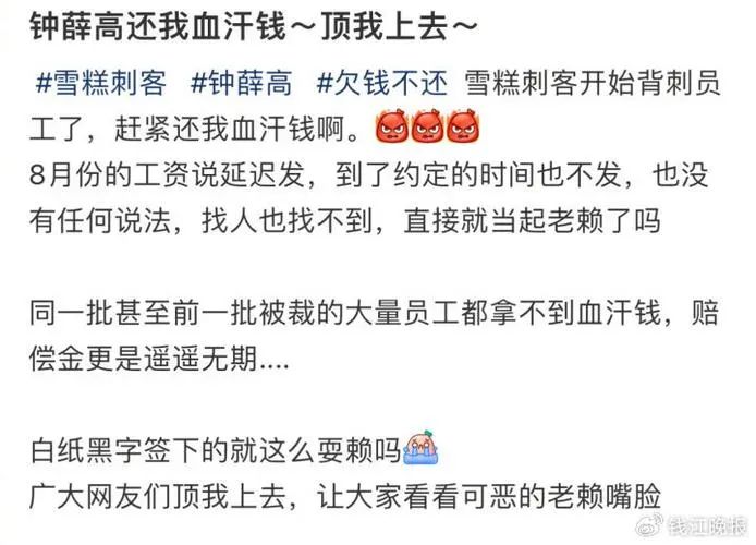 據(jù)潮新聞報(bào)道,有自稱鐘薛高客服部門“前員工”的網(wǎng)友表示,在公司效益不好優(yōu)化期間,該員工等6人與公司人事提出優(yōu)化補(bǔ)償,并簽署了離職同意單,約定補(bǔ)償金和工資10月15日發(fā)放,當(dāng)天公司未履約。該員工討要說法,“公司回復(fù)賬戶上沒有錢補(bǔ)償,說要等,沒有具體的時(shí)間點(diǎn)!