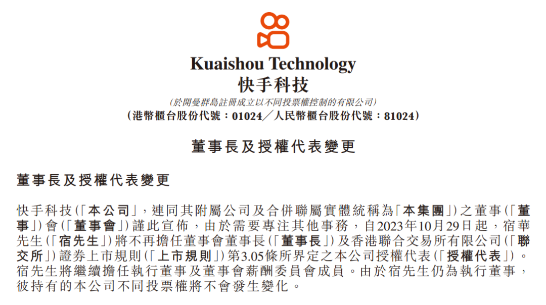 直到最新一幕,宿華正式辭任董事長一職。公告顯示,自2023年10月29日起,宿華不再擔(dān)任董事會董事長,將繼續(xù)擔(dān)任執(zhí)行董事和薪酬委員會成員,其不同投票權(quán)不會發(fā)生變化。而宿華表示,將繼續(xù)致力于為集團(tuán)創(chuàng)造長期價值,并相信集團(tuán)有堅(jiān)實(shí)的基礎(chǔ)實(shí)現(xiàn)戰(zhàn)略目標(biāo)。