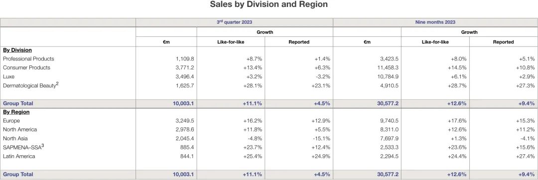 10月19日,全球最大化妝品集團歐萊雅發(fā)布三季度報,顯示第三季度銷售額305.7億歐元,同比增長12.6%,在可比結構和相同匯率計算的基礎上增長11.1%,略低于預期的11.5%。