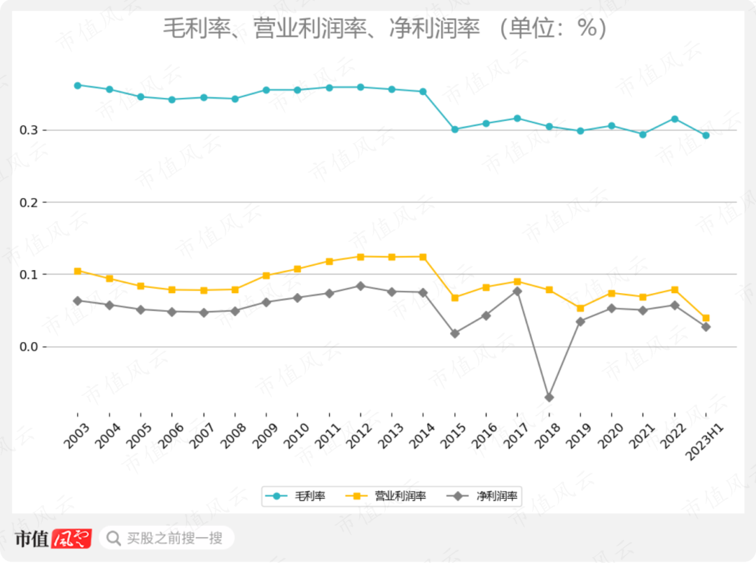 在過(guò)去20年的大趨勢(shì)上,公司的毛利率、營(yíng)業(yè)利潤(rùn)率、凈利潤(rùn)率都在下滑。截至2023年H1,三項(xiàng)數(shù)據(jù)分別為29.86%、3.93%、3.41%。