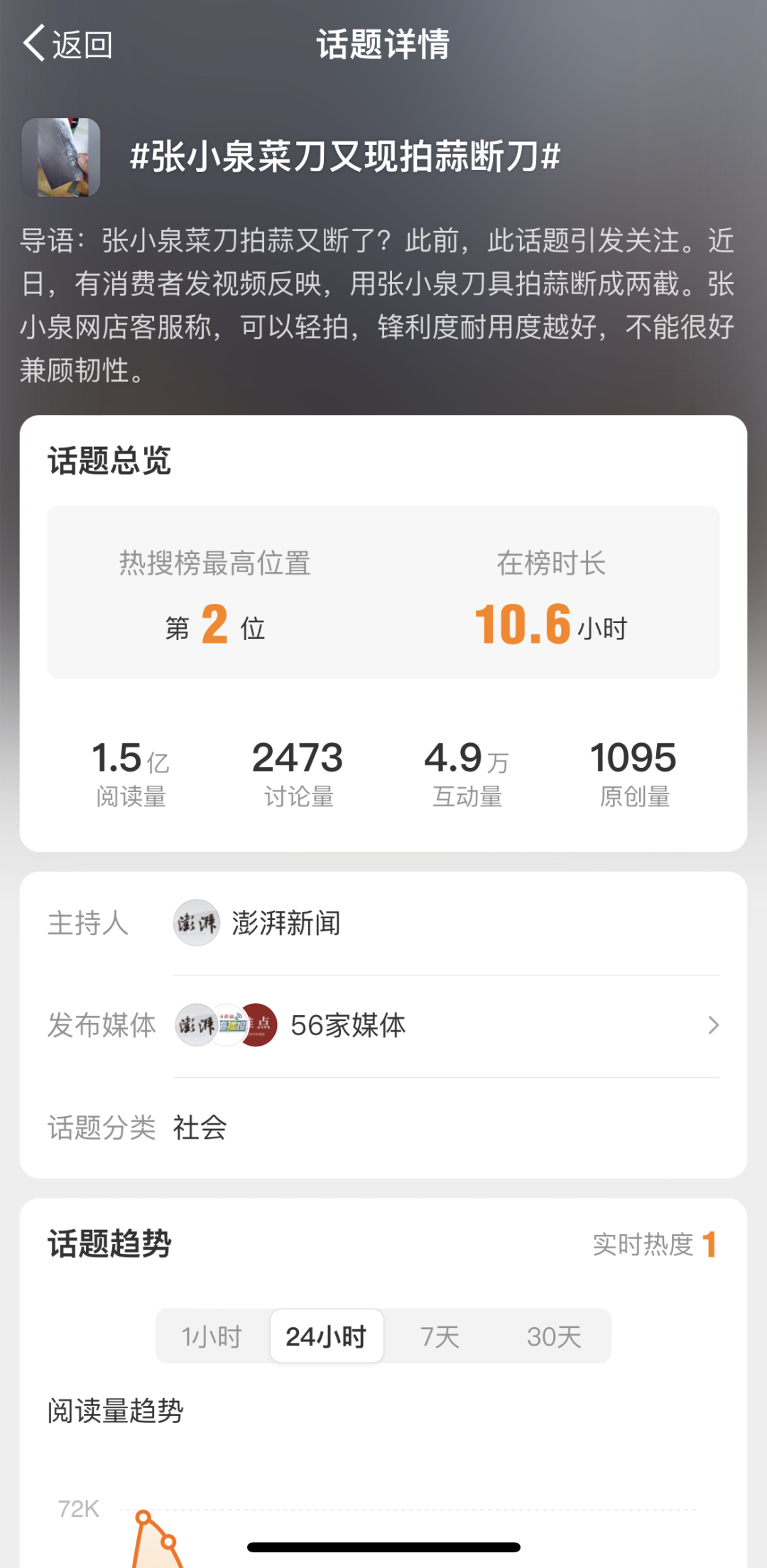 有消費者此前發(fā)視頻反映,用張小泉的菜刀拍蒜斷成兩截。該話題在10月20日當(dāng)天登上了微博熱搜第2名,在榜時長達(dá)10.6個小時,有1.5億的閱讀量和2473的討論量。