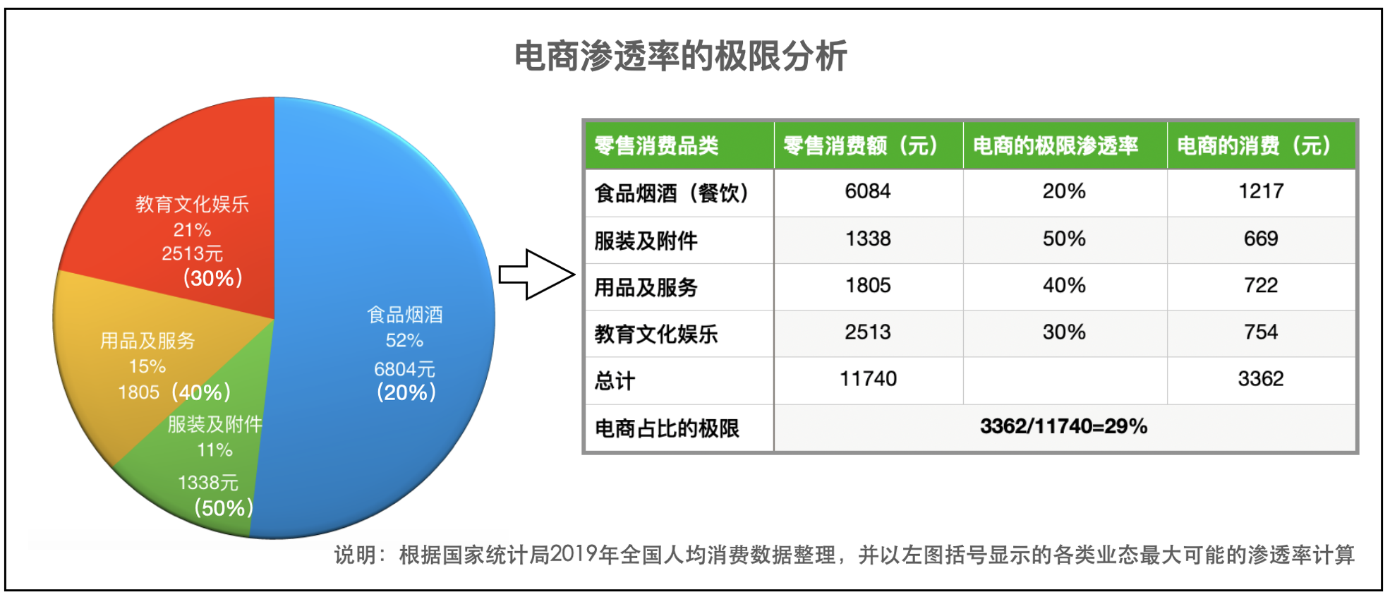 自己曾于2022年9月撰文《馬王“十年賭約屆滿”,誰知電商的天花板也出現(xiàn)了》,文章以2019年國家統(tǒng)計局就國內(nèi)的食品煙酒、用品和服務、服裝及附件和教育文化娛樂的消費數(shù)額和比例推測各類商品或服務可能達到的最大電商滲透率。比如包括餐飲在內(nèi)的食品煙酒,筆者采用比全國商超15%的更高的20%滲透率,也足以包括美團和餓了嗎等到家的餐飲。其他如用品和服裝都按最高的極限比例推測,但服務、文化和娛樂等肯定是電商鞭長莫及的。就這樣國內(nèi)電商的天花板就是29%(見圖2),最高不會超過30%。